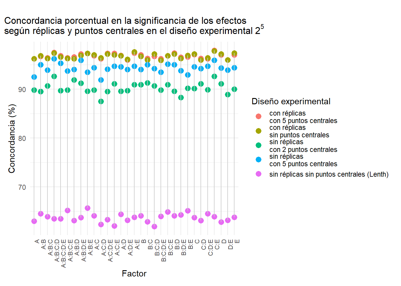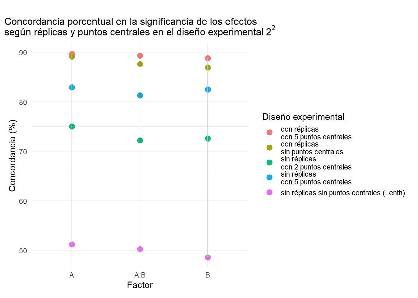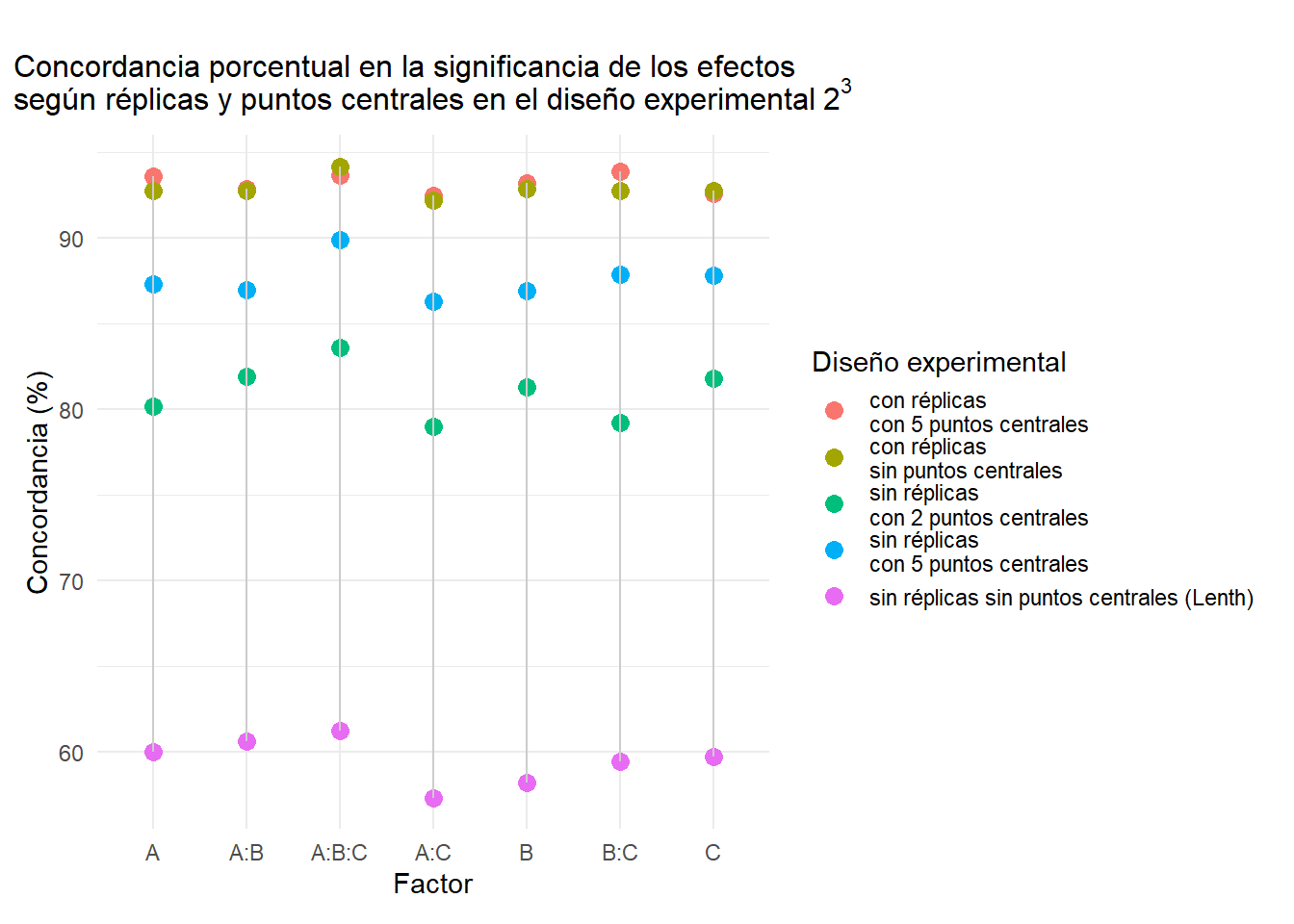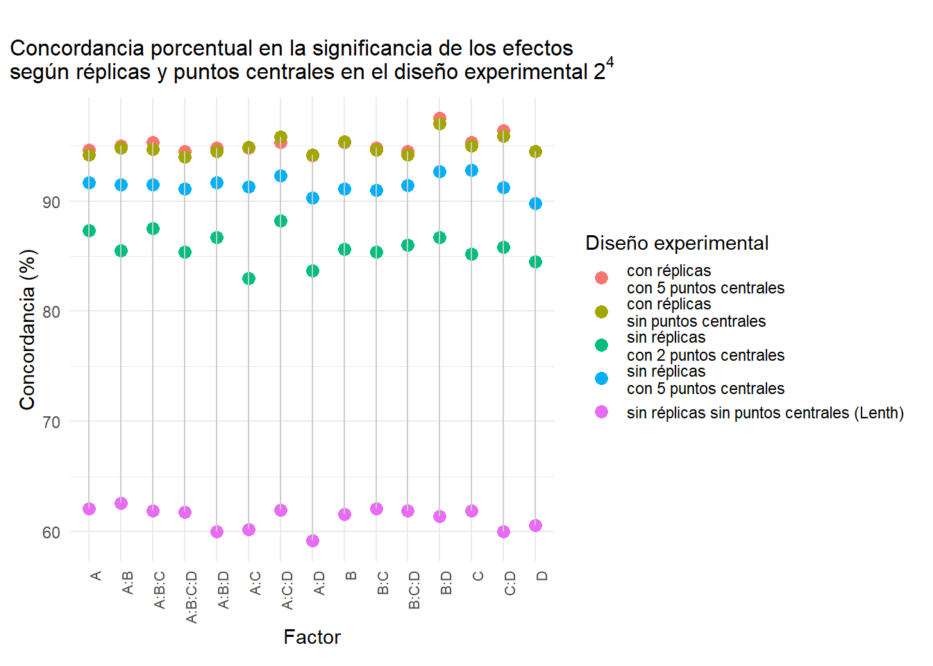 Las tablas obtenidos a partir de cada diseño experimental se comparan con la tabla efectos_reales y se calculan los siguientes aspectos: - Concordancia (%): Porcentaje de concordancia entre la significancia real de cada efecto y los detectados por cada diseño. - Potencia (%): Porcentaje de efectos verdaderamente significativos y correctamente identificados como tal por el diseño experimental. - Error tipo I: Proporción de efectos no significativos detectados como significativos por el diseño experimental.